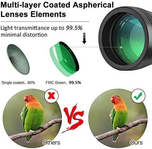 - [Professional Powerful Binoculars]- Multilayer-coated aspherical lenses elements provide superior light transmission and minimal distortion, better image brightness, contrast and quality. The Bak-4 prism has a perfectly round exit pupil. Providing bright, clear and razor-sharp viewing.