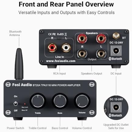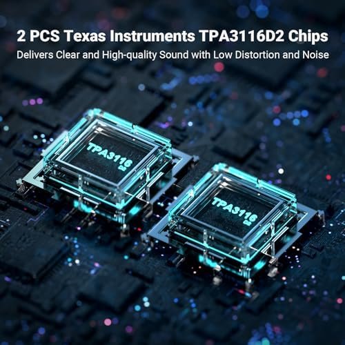 - Bluetooth 5.0 Amplifier: Featuring two Texas Instruments TPA3116D2 chips, the BT20A delivers powerful and clear stereo sound. The TPA3116D2 is a highly efficient digital amplifier with an advanced oscillator/PLL circuit, ensuring minimal interference and offering a robust connection range of up to 50 feet.