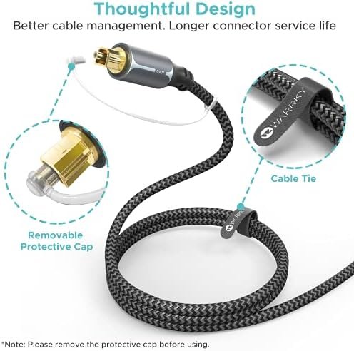 - [Secure & Snug Connection] Extra thicker gold-plated layer and anti-losing buckle enable this Digital Audio Optical Cable fits standard Toslink (s/PDIF, Optical) port snugly. Thoughtful rubber cap and cable tie help you store this fiber optics cable easier. Free from dust accumulation. Better connector protection.